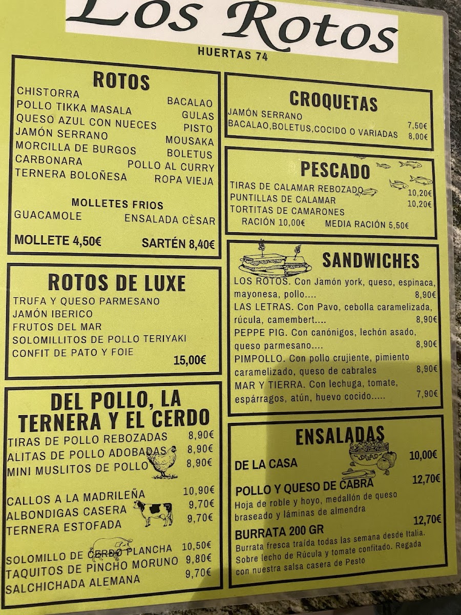 Los Rotos offers a menu rooted in the tradition of Madrid’s beloved tapas culture, balancing simple, hearty dishes with approachable flavors. The selection is perfect for those looking to enjoy casual bites that satisfy, featuring a range of classic tapas alongside more substantial plates designed to share.
